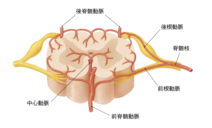 椎骨動脈、上行頸動脈、肋間動脈、腰動脈の脊髄枝は椎間孔を通って前根動脈と後根動脈に分かれて脊髄に入ります。