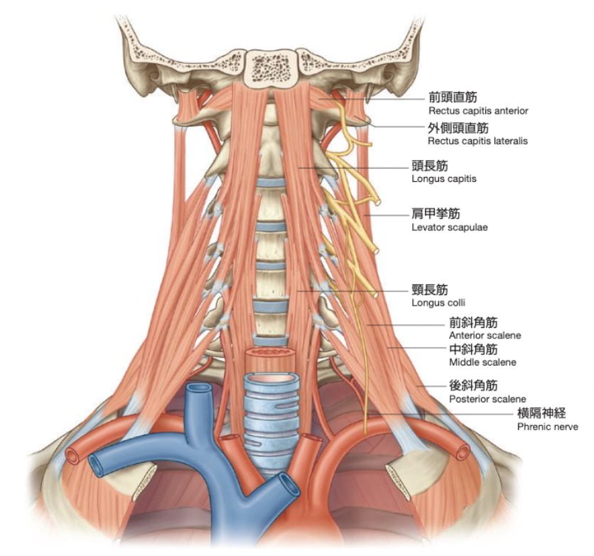 椎前筋は頚長筋と頭長筋の総称で、頸椎の前面にある首のインナーマッスルです。