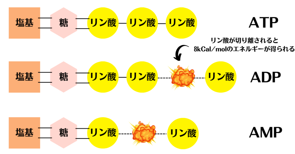 といってもATPを使うのではなく、ATPからリン酸を切り離す時に放出されるエネルギーを利用しています。
