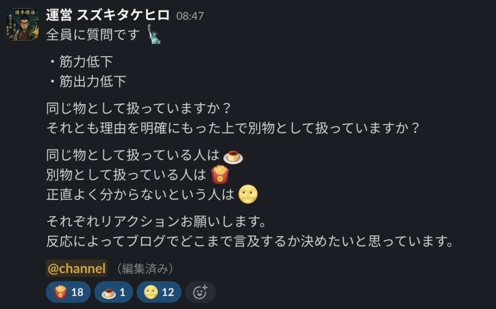 質問をした意図としては、毎月のZoomMTGの中での症例相談で「〇〇筋の筋力低下があったので…」という評価報告と「筋力低下があった〇〇筋のトレーニング、促通をしました」という治療報告を聞くことが多く、これを聞くとぼくが毎回思うことがありまして。
