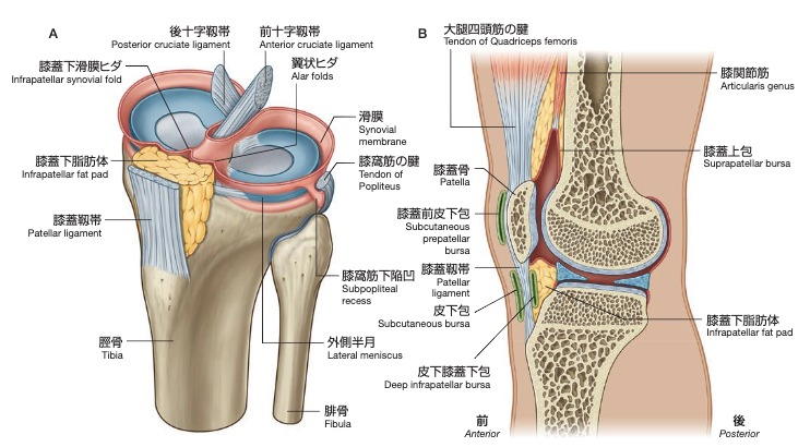 また上方は膝蓋骨下端、後方は膝蓋横靭帯を介して内・外側半月板と連続していると言われています。